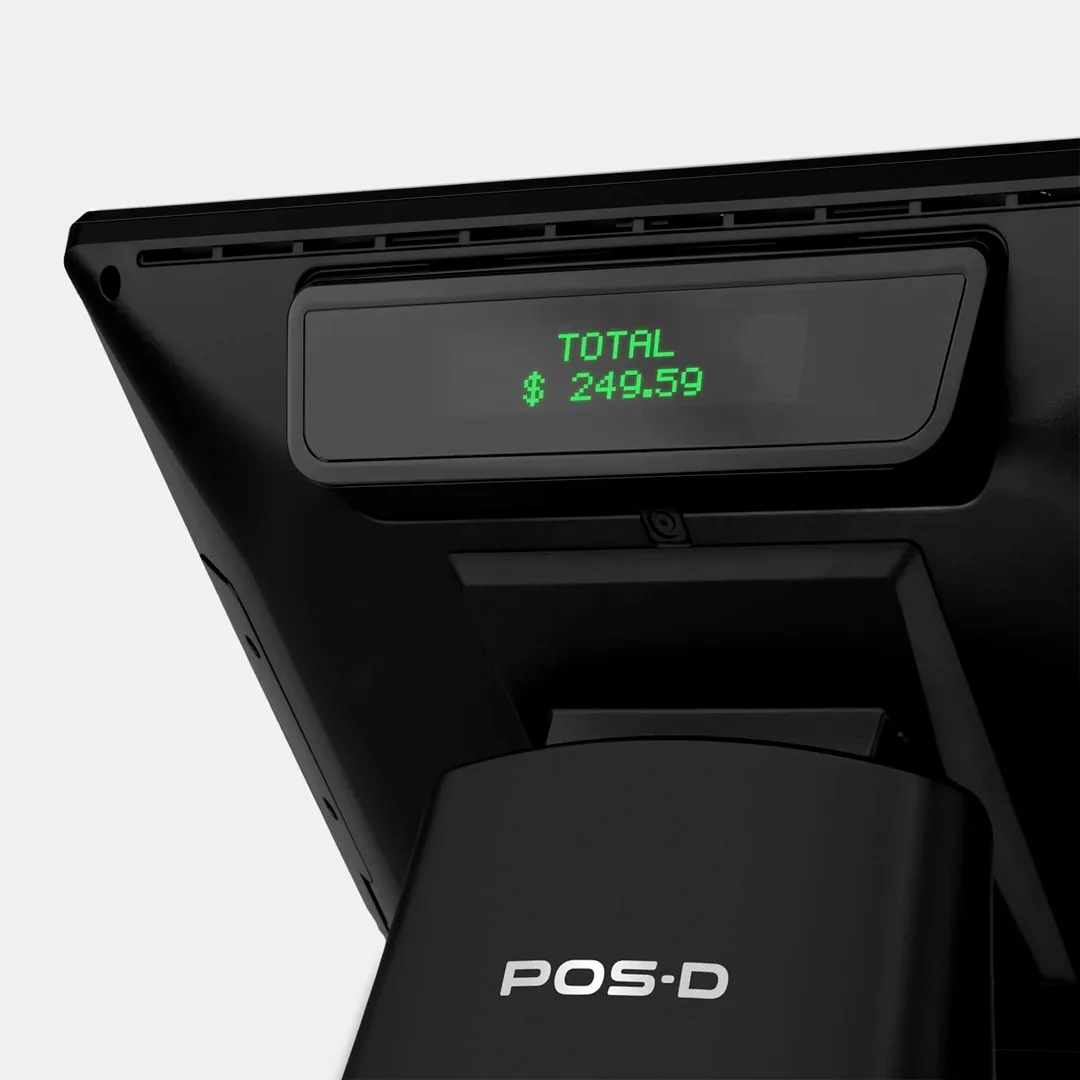 Terminal de punto de venta semi industrial, robusto, fiable y con excelente relación calidad precio, ideal para responder a las exigencias que demanda el crecimiento de tu negocio. Cuenta con una pantalla bezel free (sin marco) de 15” con tecnología capacitiva que soporta salpicaduras de agua. Base desmontable para rackear en la pared, cuenta con un display posterior de cliente de 2 líneas