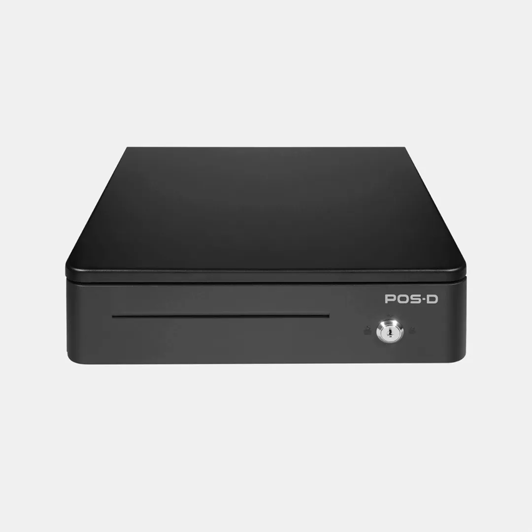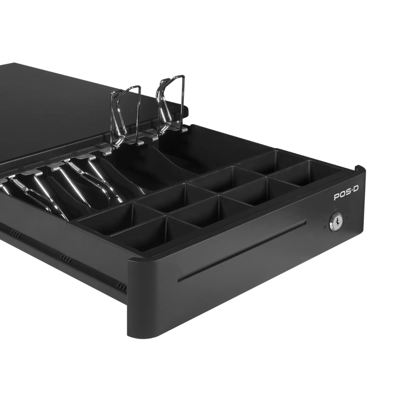 Cajón de dinero de metal pintado al horno funcional y resistente con 4 divisiones para billetes y 8 para monedas de 33 cm de ancho ideal para aquellos puntos de venta con espacio reducido.