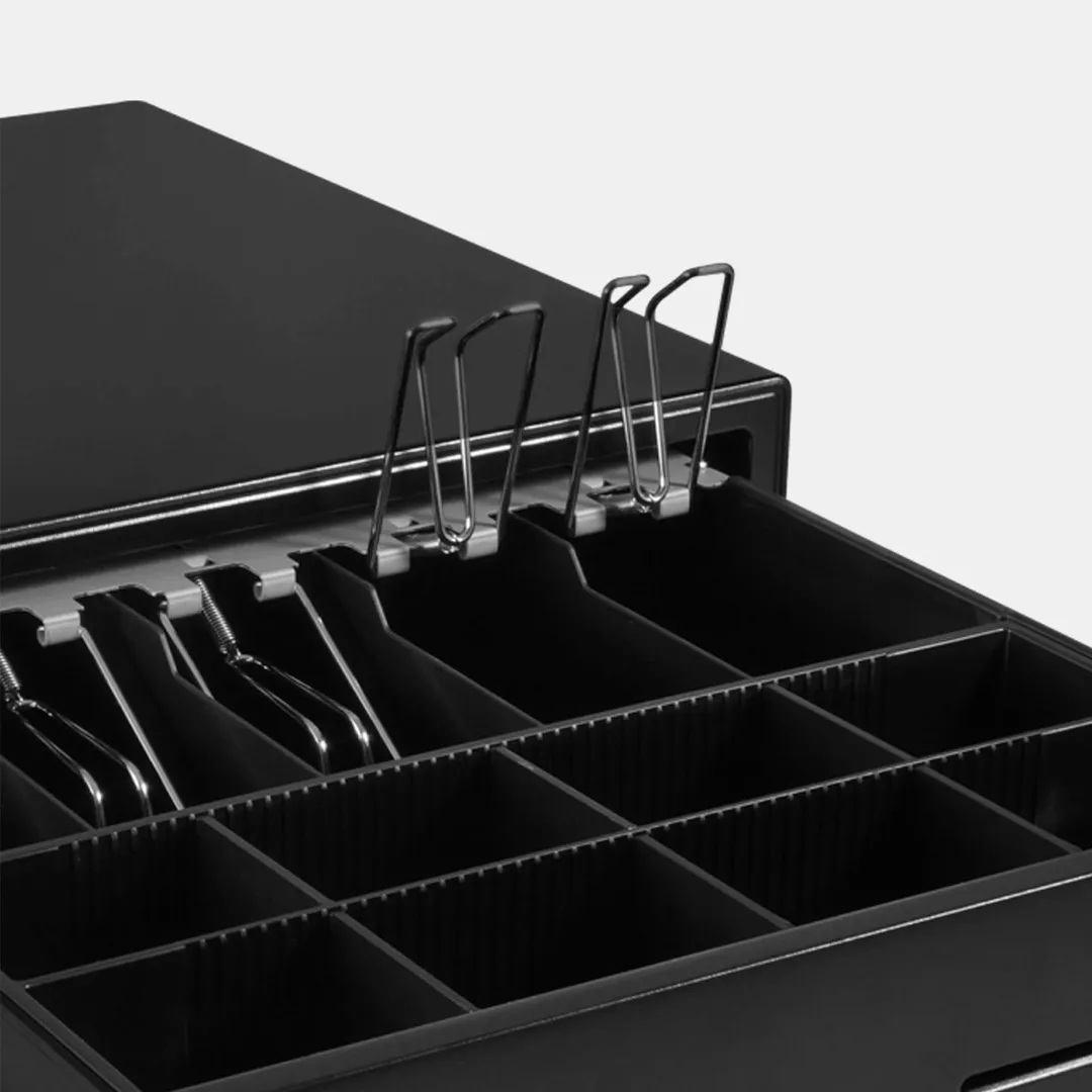 Cajón de dinero de metal pintado al horno robusto y resistente con 5 divisiones para billetes y 8 para monedas de 41 cm de ancho preparado para soportar exigentes condiciones uso.