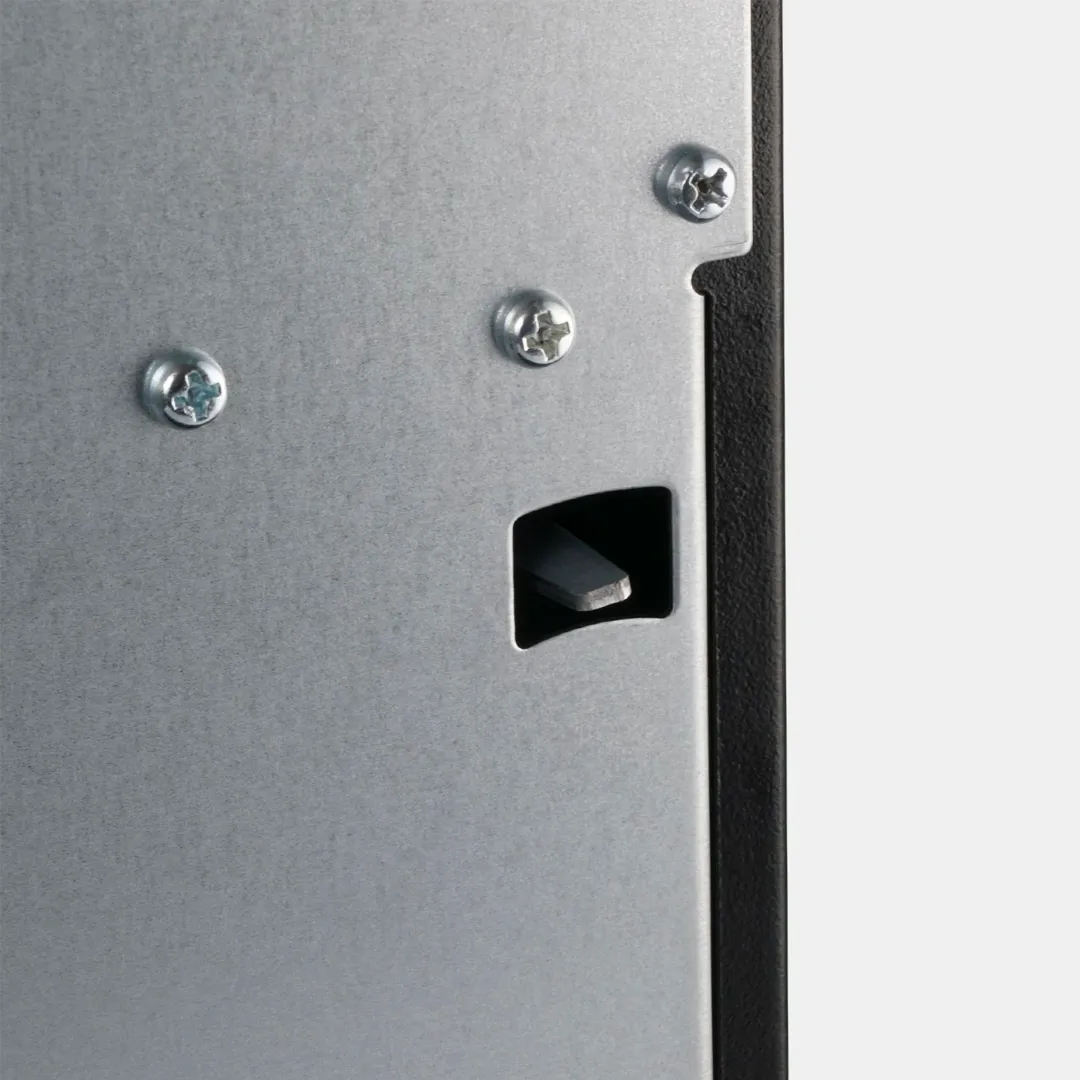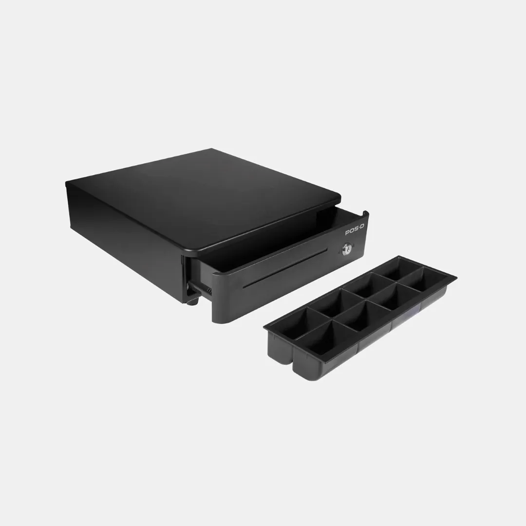 Cajón de dinero de metal pintado al horno funcional y resistente con 4 divisiones para billetes y 8 para monedas de 33 cm de ancho ideal para aquellos puntos de venta con espacio reducido.