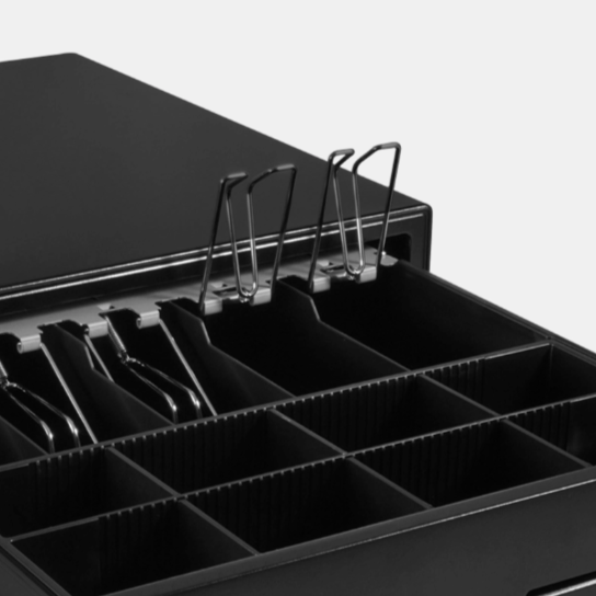 Cajón de dinero de metal pintado al horno robusto y resistente con 5 divisiones para billetes y 8 para monedas de 41 cm de ancho preparado para soportar exigentes condiciones uso.
